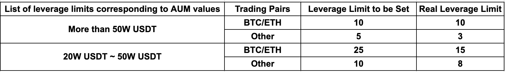 إضافة أداة للتحكم في الحد الأقصى للرافعة المالية الحقيقية: بناءً على حدود الرافعة المالية القصوى الحالية، سنقوم بتعديل الحد الأقصى للرافعة المالية الحقيقية وفقًا لحجم الأصول في حساب المتداول القيادي وتحمله للمخاطر. سيساعد ذلك في ضمان بقاء مخاطر تداول المتداولين القياديين ضمن حدود يمكن السيطرة عليها، وتجنب مخاطر التصفية المحتملة الناتجة عن أحجام الصفقات الكبيرة أو الاقتراب من أسعار التصفية، وبالتالي حماية مصالح وأموال المتابعين.