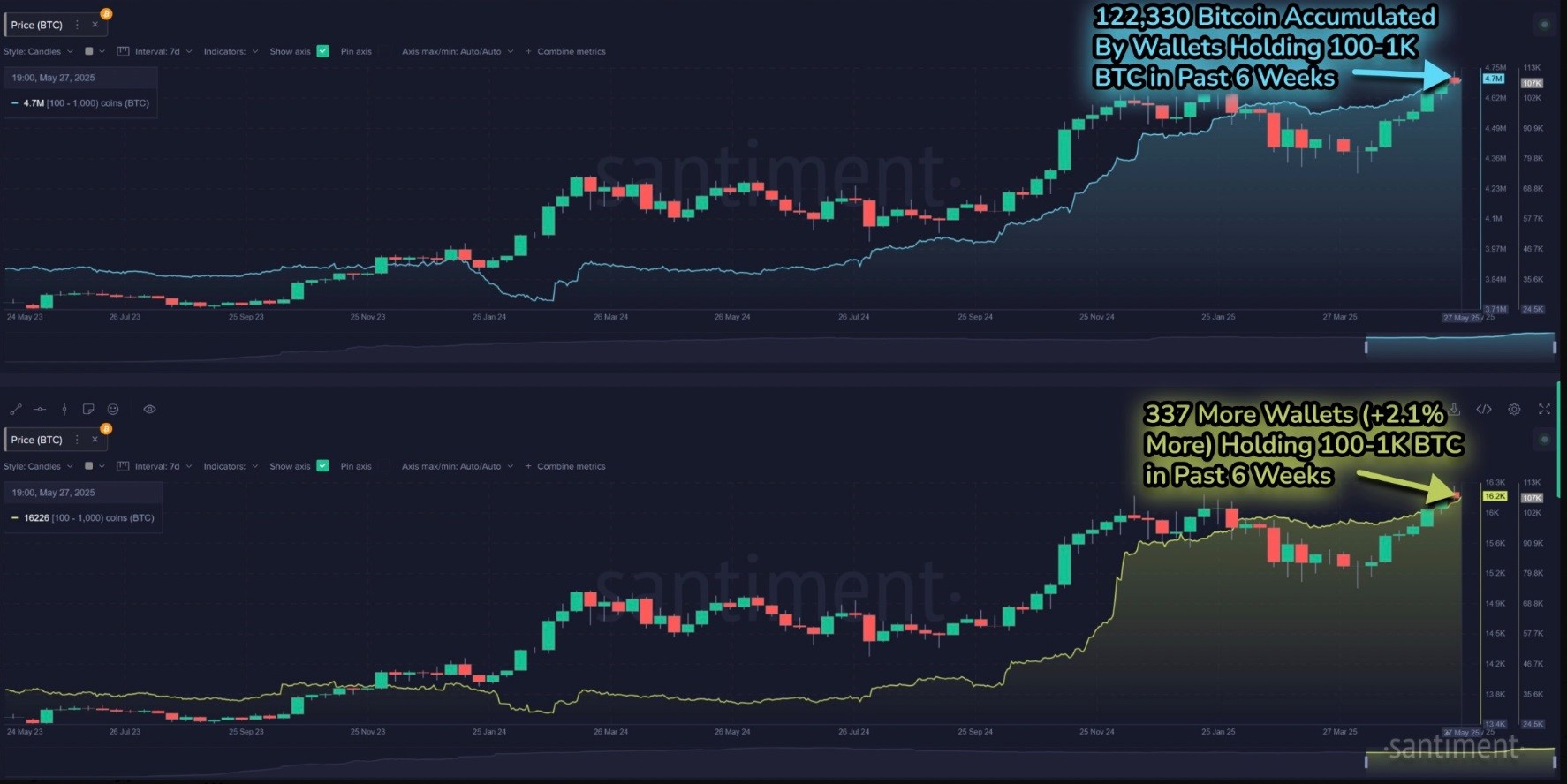 بيتكوين: إجمالي عدد الحيتان التي تحتفظ بها والتغيرات الشهرية (%) | المصدر: CryptoQuant يُبرز مزود بيانات داخل السلسلة Santiment أيضًا النشاط القوي للتجميع الذي يحدث في المحافظ التي تحتفظ من 100 إلى 1,000 بِت.