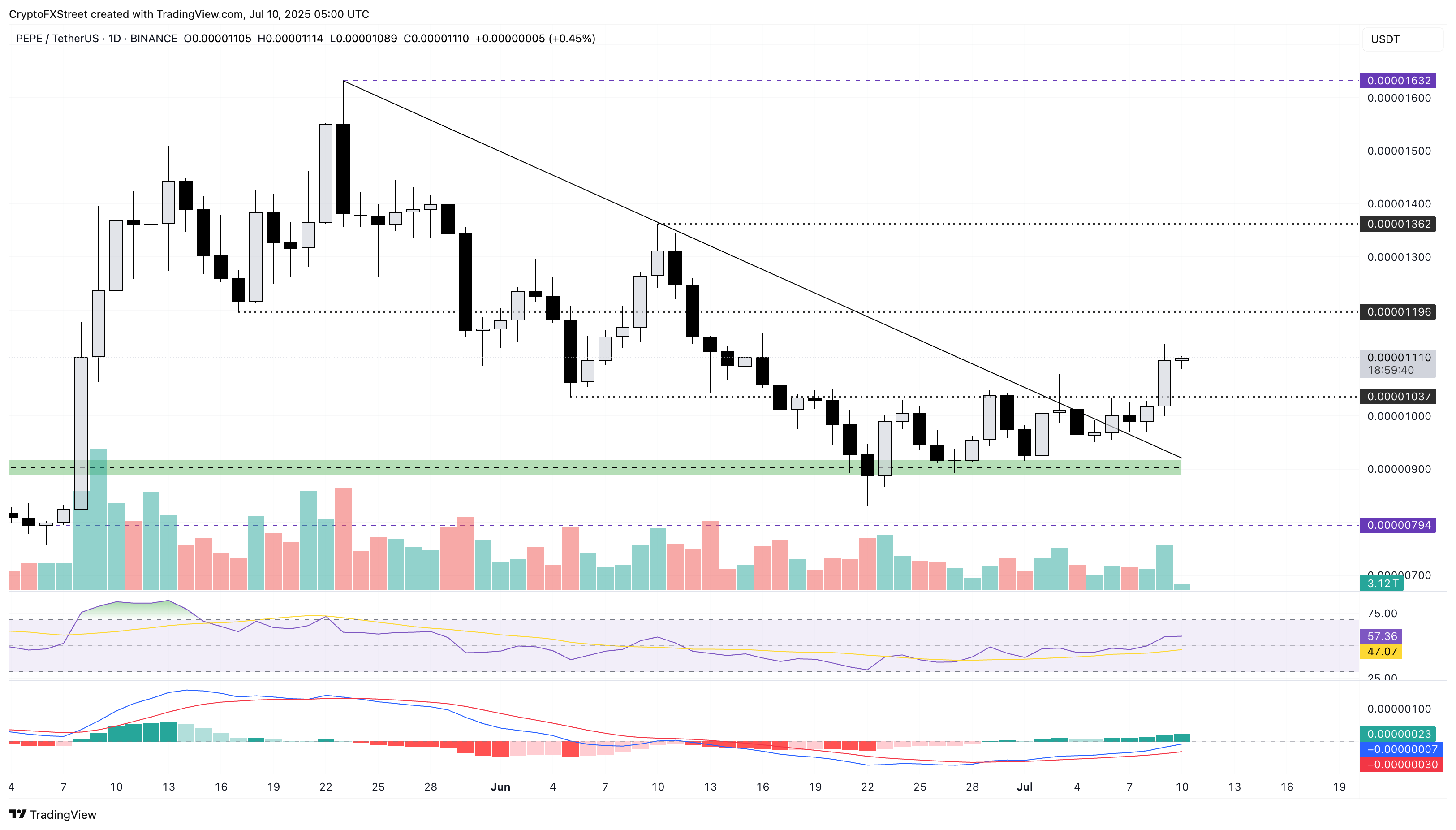 بعد ارتفاعه بنسبة 8.44% يوم الأربعاء، سجل PEPE زيادة تقارب 0.50% حتى وقت كتابة هذا التقرير يوم الخميس. كما هو موضح في الشكل أدناه، حقق هذا العملة الميمية اختراقًا لشكل مثلث هابط.