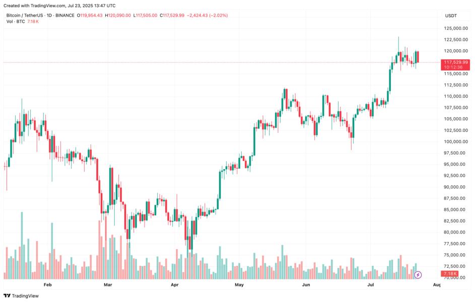 بيتكوين (BTC) حقق مستوى قياسي جديد عند 123,000 دولار الأسبوع الماضي، حيث دخل السعر في نطاق تصحيح متماسك. اليوم (24) في فترة الظهيرة الآسيوية، تم تداول السعر حوالي 117,588 دولار. أعلنت وزارة التجارة الصينية يوم الأربعاء أن نائب رئيس مجلس الدولة الصيني، هي لي فنغ، سيزور السويد من 27 إلى 30 يوليو، لعقد جولة جديدة من المشاورات الاقتصادية والتجارية مع المسؤولين الأمريكيين.