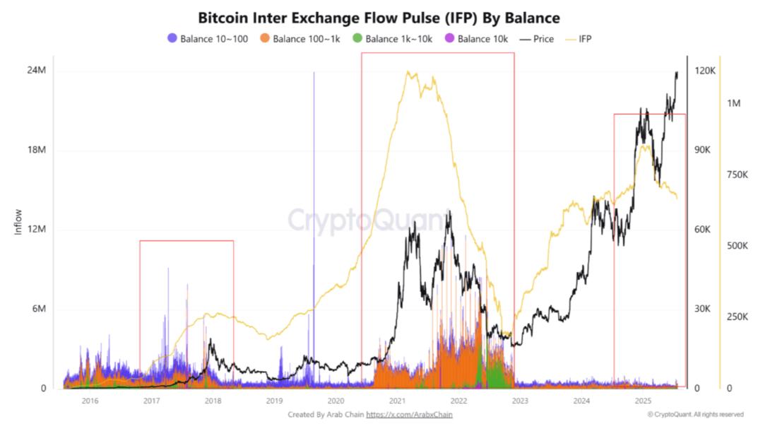 وفقًا لمقالة المساهم Arab Chain على CryptoQuant Quicktake، من المتوقع أن يظهر مؤشر تدفق حركة البيتكوين بين البورصات (IFP) “سلوكًا مثيرًا” في منتصف عام 2025. ومن الجدير بالذكر أنه على الرغم من أن سعر تداول البيتكوين قد بلغ أعلى مستوى تاريخي له، إلا أن المستثمرين الكبار يبدو أنهم لم يتخلصوا من البيتكوين الذي يمتلكونه.