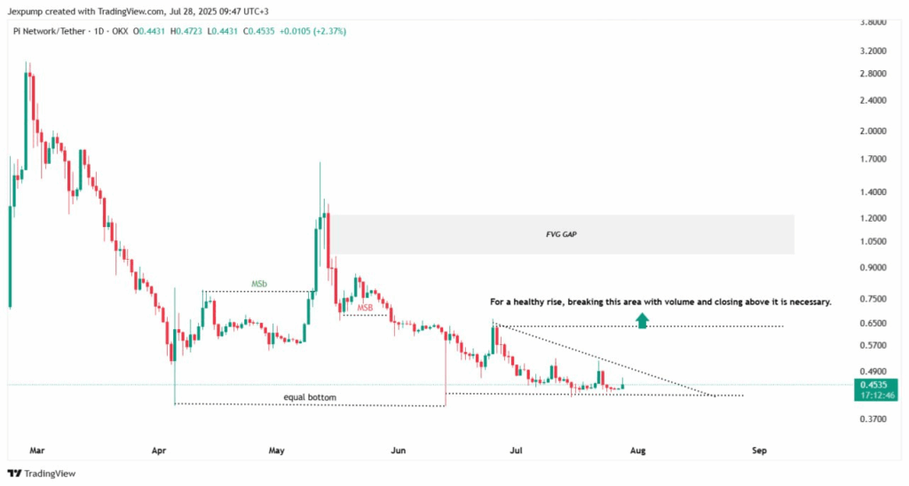 وفقًا لتحليل الرسم البياني اليومي من Crypto Jex، فإن عملة PI تشكل هيكل مثلث متماثل، حيث إن مستوى الدعم السفلي متساوي، مما يحافظ على السعر عند 0.45 دولار. وأشار إلى أن الاختراق الصحي يتطلب حجم تداول قوي، ويجب أن يكون سعر الإغلاق اليومي أعلى من منطقة 0.65-0.70 دولار.