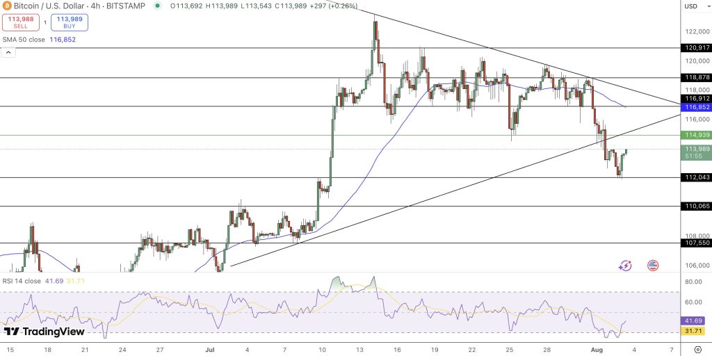 بعد أن انخفضت البيتكوين تحت مثلث متساوي الأضلاع، السعر الحالي حوالي 114,815 دولار. يظهر الرسم البياني لكل 4 ساعات اتجاهًا هبوطيًا، حيث ظهرت ثلاث شموع سلبية متتالية، تشبه نمط «ثلاث غربان سوداء». يقع متوسط الحركة لمدة 50 فترة (SMA) عند 116,852 دولار، وقد أصبح حاليًا مستوى مقاومة صعودي.