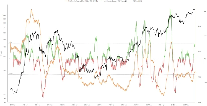 تظهر بيانات CryptoQuant أن حسابات “الحيتان” التي تملك أكثر من 1,000 BTC ساهمت بأكثر من 70% من الودائع في التبادل في 1 أغسطس، حيث تم إرسال أكثر من 40,000 بيتكوين بأسعار منخفضة إلى التبادل في ذلك اليوم، مما يجعلها أكبر تدفق يومي منذ منتصف يوليو. دفعت هذه السلوكيات “نسبة الحيتان في التبادل” إلى مستويات تاريخية مرتبطة بالضغوط البيعية قصيرة الأجل.