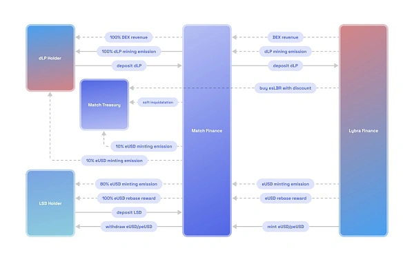 بالنسبة للسؤال الأول ، تفتح Match ودائع dLP و LST ، بعد إيداع المستخدمين ، سيتطابق البروتوكول ديناميكيا مع dLP و LST الديناميكي للسك eUSD لكسب الحد الأقصى من انبعاثات esLBR ، والعملات المعدنية ، والاسترداد ، وعمليات إدارة المخاطر الموحدة موحدة بواسطة البروتوكول لتحسين الكفاءة وتوفير الغاز ، كما أن إدارة سك العملة الموحدة تقلل بشكل كبير من مخاطر التصفية ، وتواجه سيناريوهات متطرفة ستقوم Match أولا بالتصفية داخليا بدلا من Lybra ، مما يقلل بشكل كبير من خسائر تصفية المستخدم. يمكن للمستخدمين اختيار إيداع إما LST أو dLP لكسب الدخل ، مع تقسيم 20٪ من أرباح مودع LST بين مزود dLP ، وإذا تم إيداع كلاهما ، يتم احتساب العوائد بشكل منفصل.