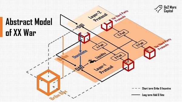 إذا أراد نظام بيئي أن يبدأ حربا على الحوكمة، فإنه يحتاج عادة إلى بروتوكول أساسي يتمتع بسيولة كافية لجذب العوامل الخارجية؛ يجمع بروتوكول الطبقة الثانية حقوق الحوكمة من خلال زيادة العائد من رموز الحوكمة ويخلق قناة حوكمة أكثر كفاءة. تدفع بروتوكولات الطرف الثالث فوائد للحصول على سيولة البروتوكول الأساسي وتوفير عوامل خارجية لتشغيل النظام ؛ توفر اتفاقيات الرشوة قناة رشوة للسيولة قصيرة الأجل.