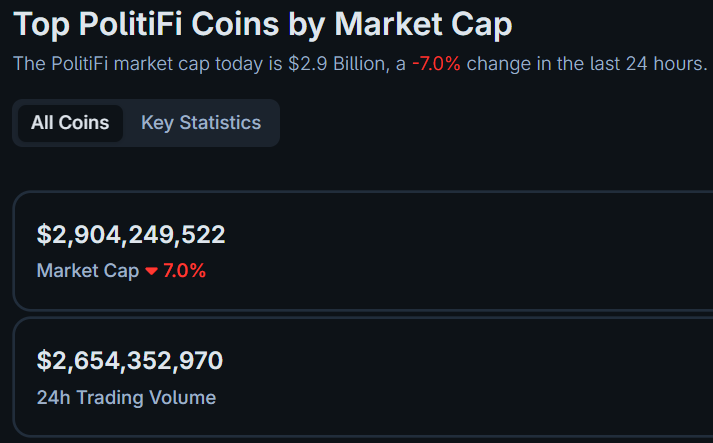 بينما انخفضت القيمة السوقية العالمية للعملات المشفرة بنسبة 2.33% في اليوم الماضي، انخفضت قيمة رموز PolitiFi بنسبة 7% إلى 2.9 مليار دولار.
