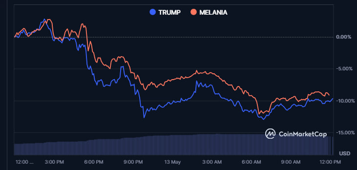 بينما أدى تراجع البيتكوين من أعلى مستوى له فوق 105,000$ إلى 102,900$ في وقت الصحافة إلى انخفاضات ملحوظة في مجال العملات البديلة، يبدو أن الرموز الميم المرتبطة بالسياسة عانت أكثر.
