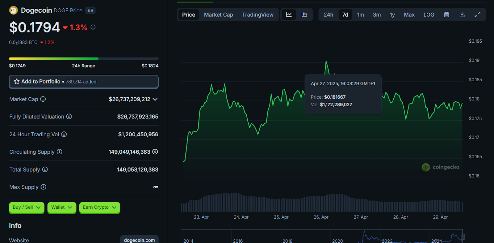 ! ** مخطط أسعار Dogecoin (Weekly) ، 29 أبريل 2025 | المصدر: CoinGecko **