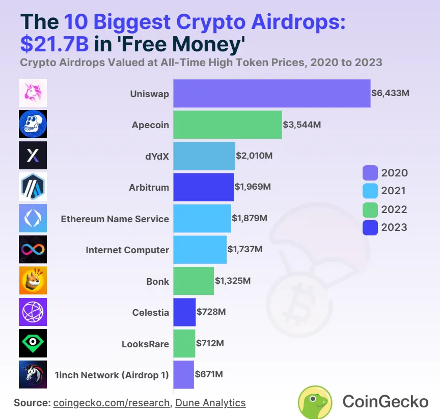 من حيث حجم الأموال بالمعادل بالدولار، تجاوز توزيع Lighter 1inch ($671 مليون ) واحتل المركز العاشر في التصنيف العام. ولا يزال Uniswap في الصدارة، حيث وزع رموزًا بقيمة 6.43 مليار دولار في عام 2020.