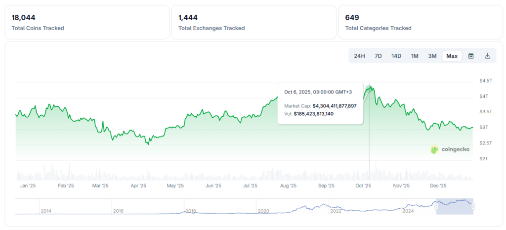 Согласно CoinGecko, на пике показатель достигал $4,3 трлн, но к концу года скорректировался примерно до $3,05 трлн