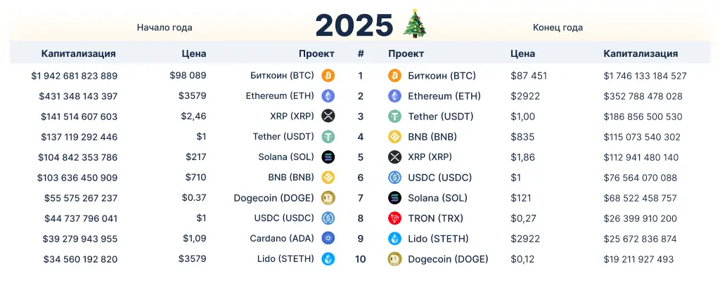 Крупнейшие по капитализации цифровые активы (по состоянию на 1 января и 29 декабря 2025 года). Данные: CoinGecko.Цена Ethereum притормозила в районе $3000, за 12 месяцев потеряв 12%. В августе активу удалось установить новый рекорд на $4956, хоть и всего на несколько долларов выше предыдущего ($4889 на бирже Binance).