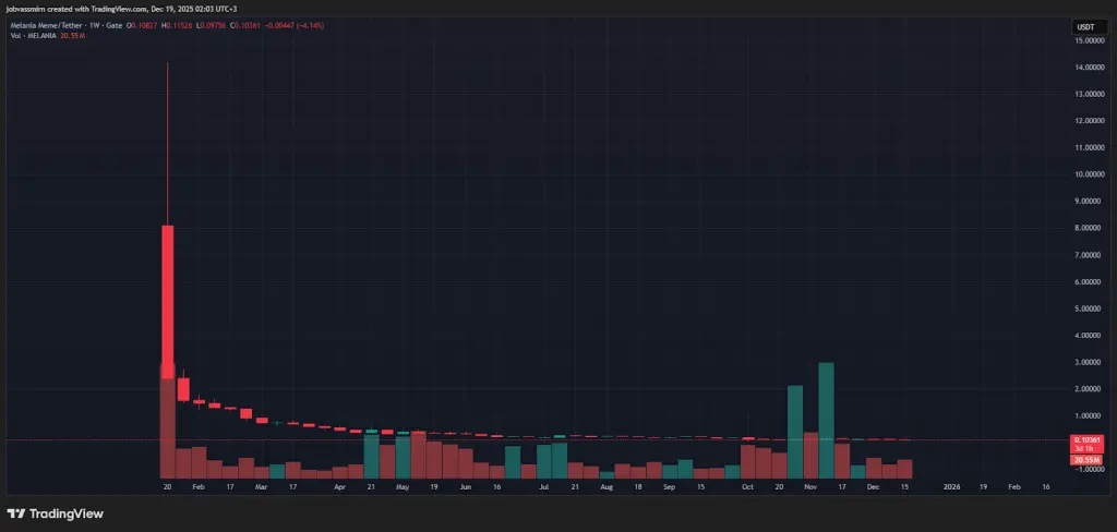 Кроме того, через день после TRUMP состоялся запуск еще одного токена президентской семьи, в этот раз от его жены — Мелании Трамп. MELANIA повторила путь предшественника, но с меньшими объемами: сначала резкий взлет, а затем такое же падение. При пике в $13 монета торгуется по $0,1.