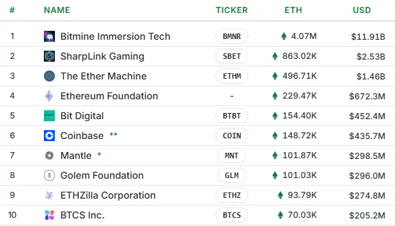 Еще 67 фирм добавили на свои балансы Ethereum. Всего они аккумулировали 6,81 млн ETH стоимостью $19,9 млрд (5,6% от общего количества монет в обращении)