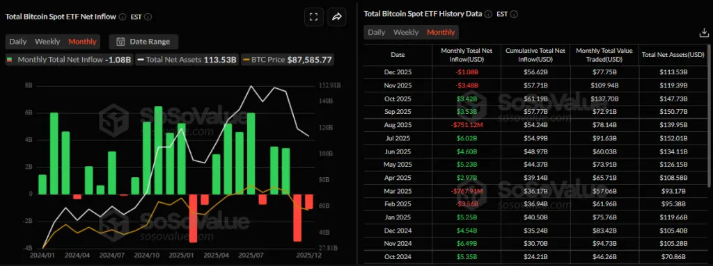Месячные приток в спотовые биткоин-ETF (по состоянию на 29 декабря 2025 года). Источник: SoSoValue.Совокупные чистые поступления в американские спотовые продукты с момента запуска инструментов в январе 2024 года составили $56,6 млрд. В общей сложности фонды поглотили 6,49% предложения монеты