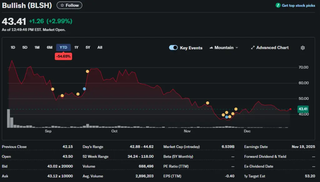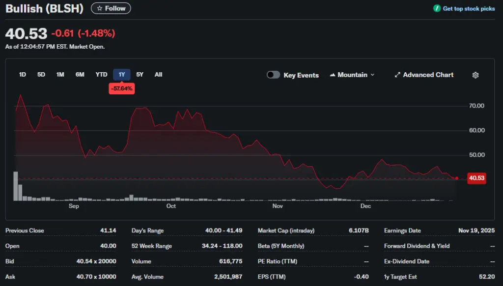 Данные по состоянию на 29 декабря 2025 года. Источник: Yahoo Finance.Следующим публичный статус получила криптобиржа Bullish. 14 августа платформа разместила на NYSE 30 млн обыкновенных акций по $37 за единицу, совокупный объем предложения составил около $1,03 млрд