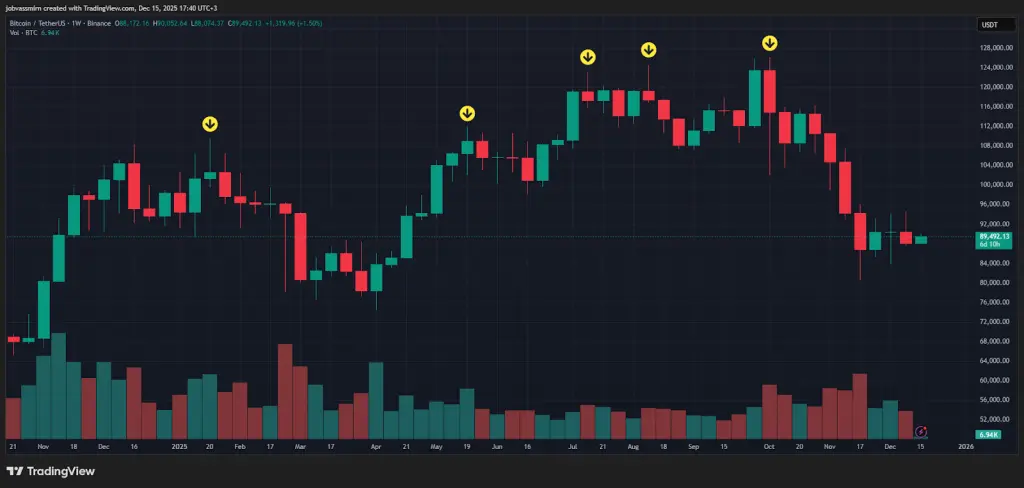 Недельный график BTC/USDT биржи Binance (стрелками отмечены пиковые точки роста в 2025 году). Источник: TradingView После обновления максимума первая криптовалюта ушла в затяжную коррекцию на пять месяцев с дном на отметке $74 500 в начале апреля. Ниже этих значений монета уже не опускалась