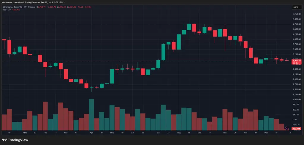 Недельный график ETH/USDT биржи Binance (по состоянию на 29 декабря 2025 года). Источник: TradingView.В начале января свой ATH обновила Solana, достигнув $293. Однако сейчас монета просела до $120.