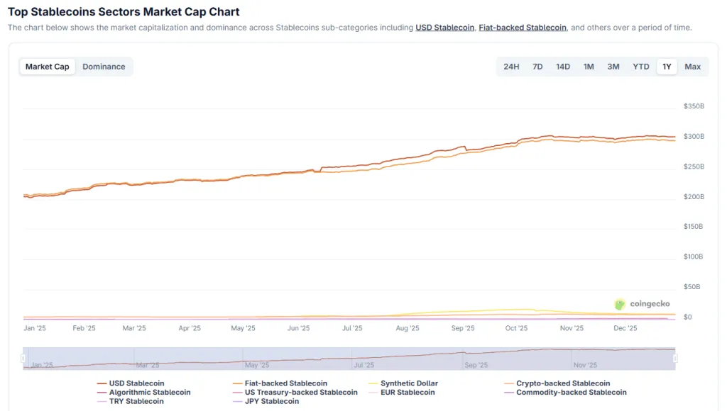 Согласно CoinGecko, за 12 месяцев показатель увеличился с $205 млрд до $312 млрд. Доля долларовых монет составляет $304 млрд