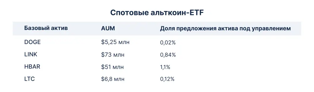 В сентябре в США запустили первые спотовые ETF на XRP и Dogecoin от REX Shares и Osprey Funds. Однако оба продукта не относятся к классическим биржевым фондам, поскольку зарегистрированы по Закону об инвестиционных компаниях 1940 года с упрощенной процедурой листинга