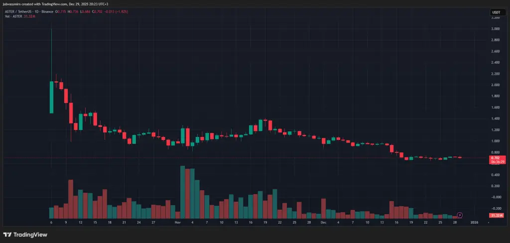Дневной график ASTER/USDT биржи Binance (по состоянию на 29 декабря 2025 года). Источник: TradingView.Основатель TRON Джастин Сан тоже присоединился к общему движению, объявив в октябре о запуске фьючерсной платформы SunPerp.