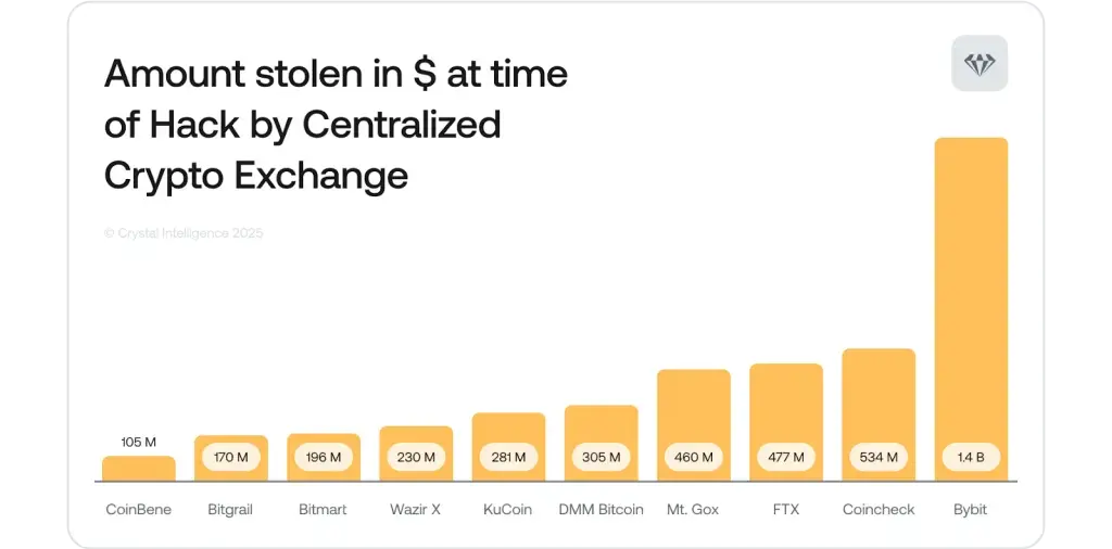 Крупнейшие взломы CEX по состоянию на апрель 2025 года. Источник: Crystal Intelligence.Одним из первых на подозрительный отток активов с Bybit указал ончейн-детектив ZachXBT. Речь шла о 499 395 ETH