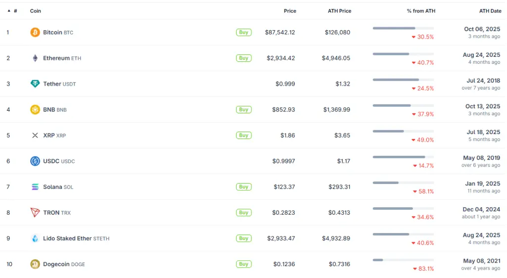 Данные по состоянию на 29 декабря 2025 года. Источник: CoinGecko.В августе цифровое золото обновило ATH выше $124 000