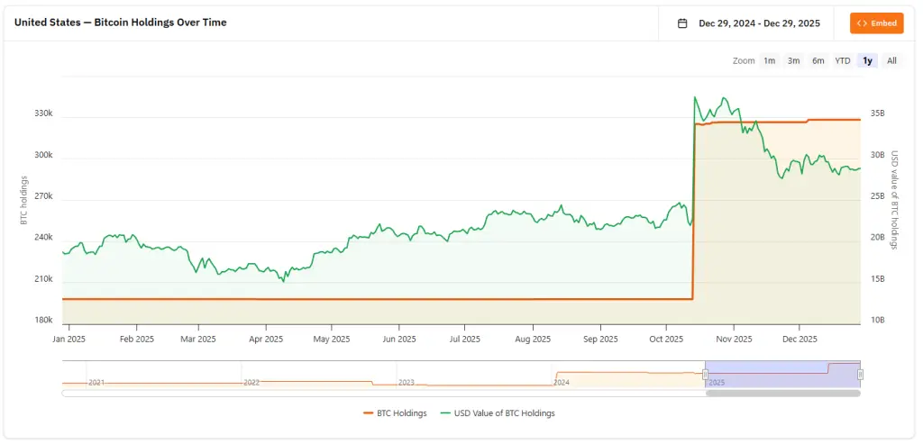 Согласно данным BitcoinTreasuries, на счете правительства США хранится 328 372 BTC на $28,77 млрд.
