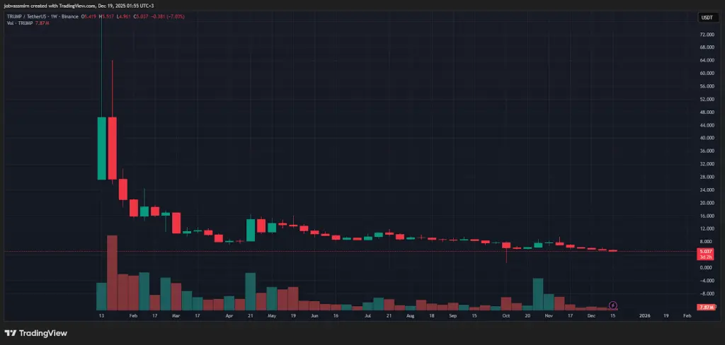 Недельный график TRUMP/USDT биржи Binance. Источник: TradingView Уже 19 января актив достиг ATH на $73, но затем его ждало стремительное падение. Сейчас TRUMP торгуется по $5