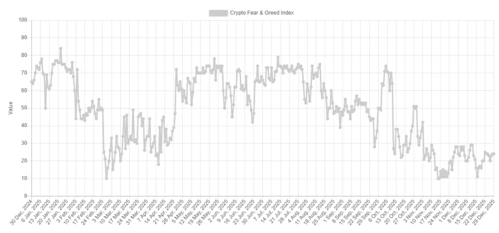 Данные по состоянию на 29 декабря 2025 года. Источник: Alternative.Несмотря на продолжающееся смягчение ставки ФРС и завершение 43-дневного шатдауна, биткоин так и не смог восстановится выше $100 000. Под конец года он удерживался на уровне $87 000.