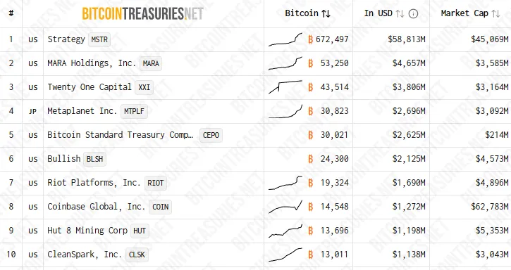 В 2025 году интерес к криптоактивам проснулся не только у правительств, но и корпоративных игроков. Пионером в этом направлении на протяжении пяти лет была Strategy Майкла Сэйлора — под управлением компании находится 672 497 BTC на сумму свыше $58 млрд, согласно BitcoinTreasuries.
