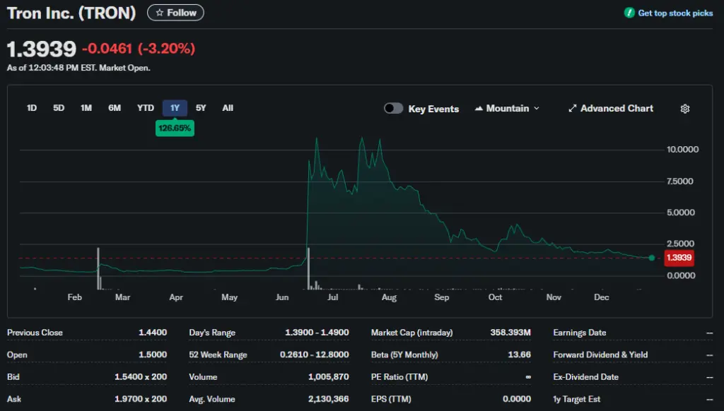 Данные по состоянию на 29 декабря 2025 года. Источник: Yahoo Finance.Летом на биржу Nasdaq вышла компания Tron, но не через IPO, а обратное слияние с уже котирующейся на торговой платформе фирмой SRM Entertainment