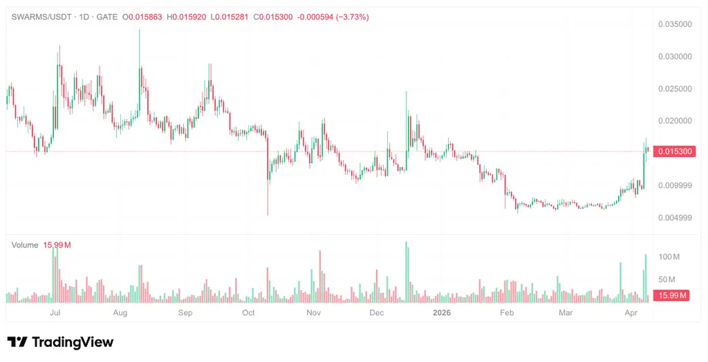 اعتبارًا من 9 أبريل 2026، تُظهر بيانات بوابة Gate أن سعر توكن SWARMS، بعد أن مرّ بفترة ركود، يُظهر في الآونة الأخيرة تقلبات سعرية ملحوظة. وبشكل محدد، وصلت نسبة التغير في سعره خلال آخر 30 يومًا إلى +125.47%، كما بلغ الارتفاع خلال آخر 7 أيام +39.87% أيضًا، وقد أُغلق السعر عند 0.01529 دولارًا. ورغم قوة الارتداد على المدى القصير، إلا أنه إذا تم تمديد خط الزمن إلى سنة كاملة، فإنه لا يزال أقل بنسبة 24.44% مقارنةً بنفس الفترة من العام الماضي. وفي الوقت نفسه، ارتفع حجم التداول خلال 24 ساعة إلى 1.64 مليون دولار، وعاد رأس المال السوقي إلى 15.3 مليون دولار، وبلغت القيمة السوقية المتداولة بالكامل 15.3 مليون دولار، في حين بلغ كلٌّ من العرض المتداول والعرض الإجمالي 999.98 مليونًا من توكنات SWARMS.