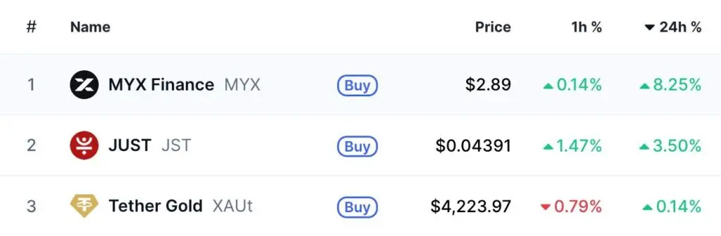 Just (JST) seguido de ganancias del 3.5%, mientras que Tether Gold (XAUT), una moneda estable respaldada por oro físico, logró estar en verde a medida que los traders parecían rotar hacia activos más seguros en medio de una mayor volatilidad en el mercado de criptomonedas.