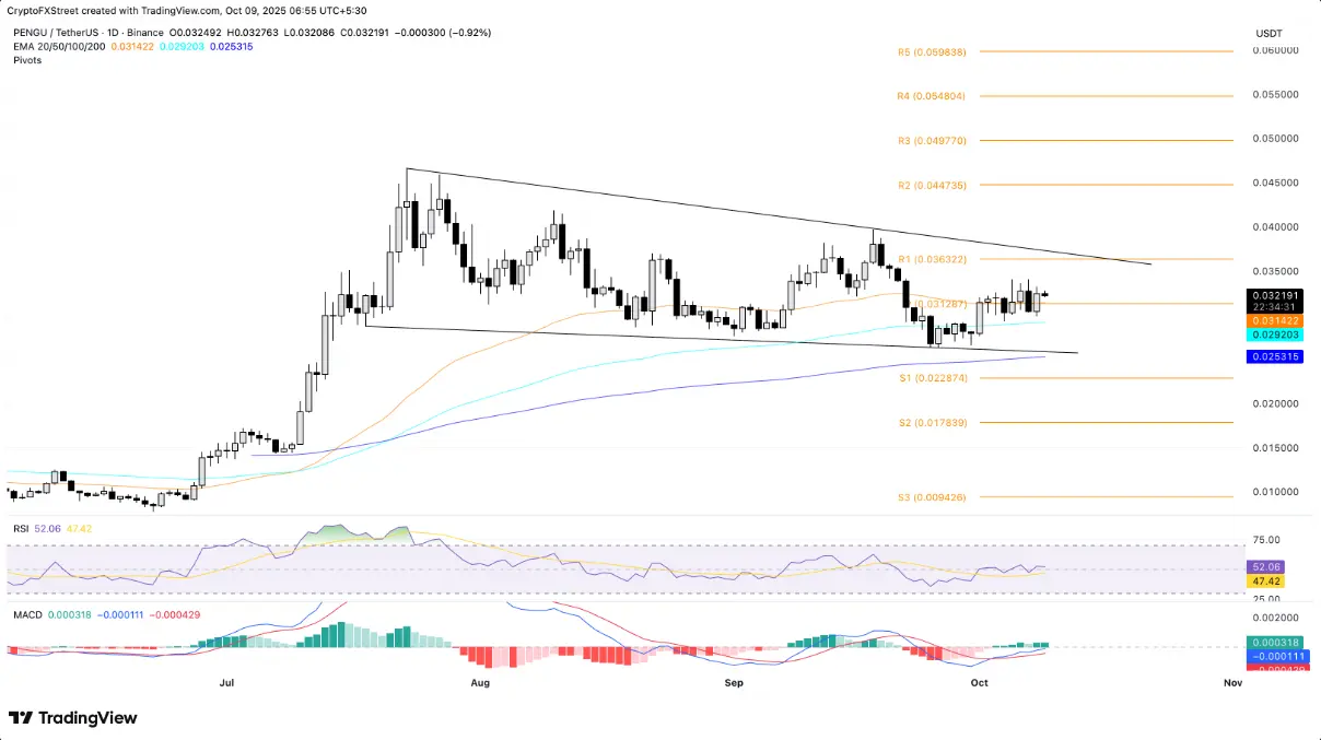 Pudgy Penguins (PENGU) maintient actuellement un état stable autour de la ligne EMA de 50 jours, continuant à se déplacer dans un modèle de canal de prix baissier sur le graphique journalier. Au moment d'écrire ces lignes, PENGU a légèrement baissé de 1 % jeudi, après avoir augmenté de près de 7 % lors de la séance précédente.