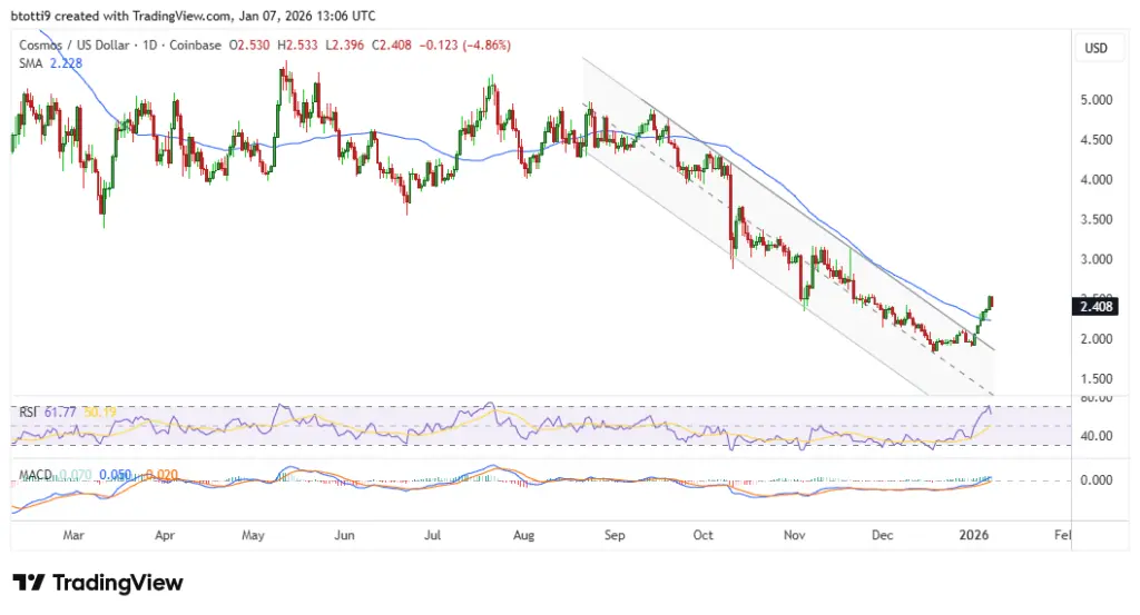 Le graphique journalier montre que Cosmos voit son jeton natif se négocier plus haut après avoir franchi la ligne de résistance d’un canal parallèle en baisse.
