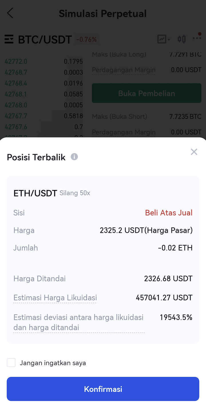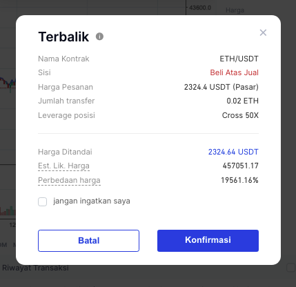 - Konfirmasi detail dalam pop-up: pasangan perdagangan saat ini, sisi posisi reverse, harga order, jumlah, dll.