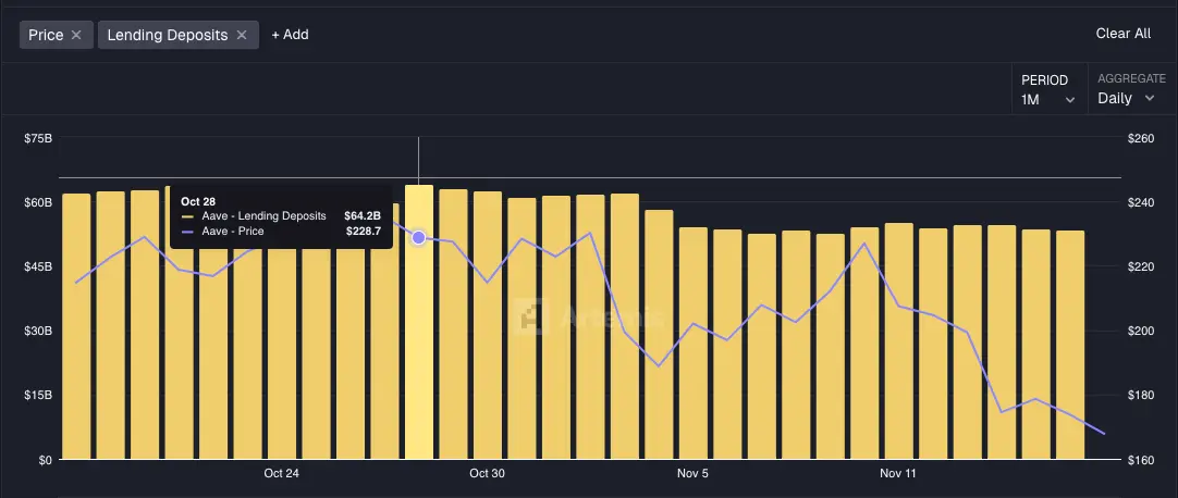 Setoran on-chain Aave turun dari $64,2 miliar menjadi $53,6 miliar antara 28 Oktober dan 17 November