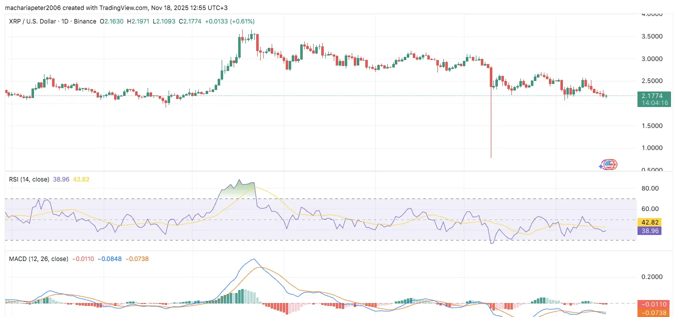 RSI XRP di 38,96 tetap di bawah level sinyalnya, sementara MACD di -0,0848 berada di bawah garis sinyalnya dengan pembacaan histogram negatif.