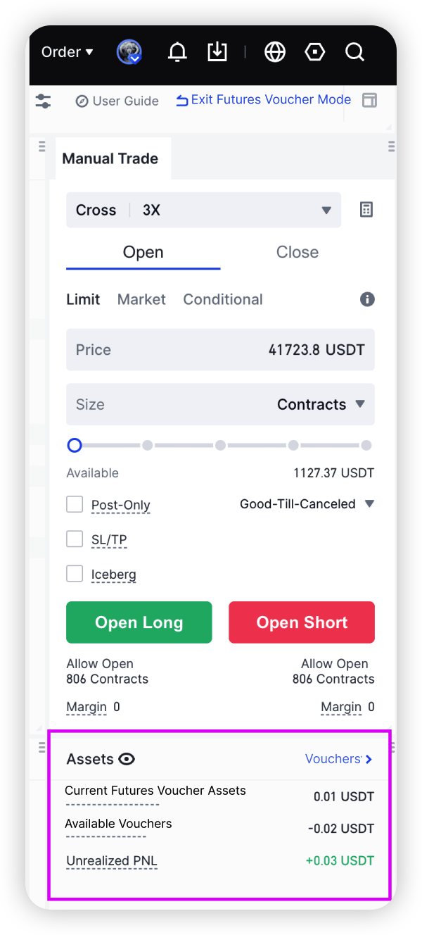 先物クーポンはUSDT建て無期限先物市場でのみ利用でき、証拠金としてポジションを開くほか、資金調達料や取引手数料の控除に使用できます。