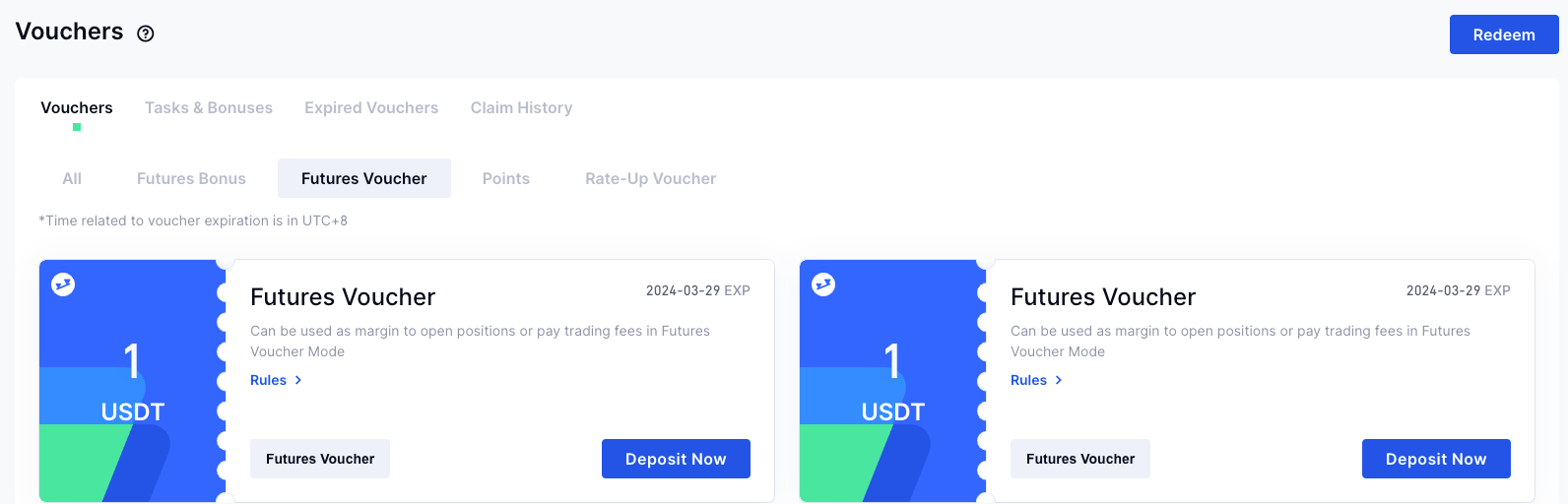 クーポンにある先物クーポンは、手動で引き換えて口座に入金する必要があります。入金成功の通知後、取引ページで使用できます。