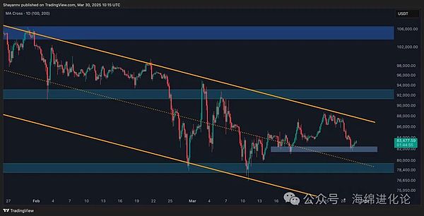 したがって、ビットコインは83000ドルを下回り、チャネルの中間線80000ドルに向かう可能性があります。これは重要な転換点です。価格を支える可能性があるものの、これを下回るとより深い下落が引き起こされ、77000ドルの閾値に向かうことになります。