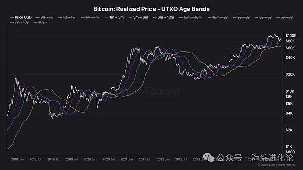 ビットコインと長期保有者のUTXOの実際の価格との相互作用は、これまで市場の動向の重要な指標であり、これらの保有者の平均取得コストを示しています。熊市は通常、価格が6-12ヶ月のグループの実際の価格を下回ることで始まり、これらの大規模な投資家が損失を被り、分配を行う可能性があることを示しています。