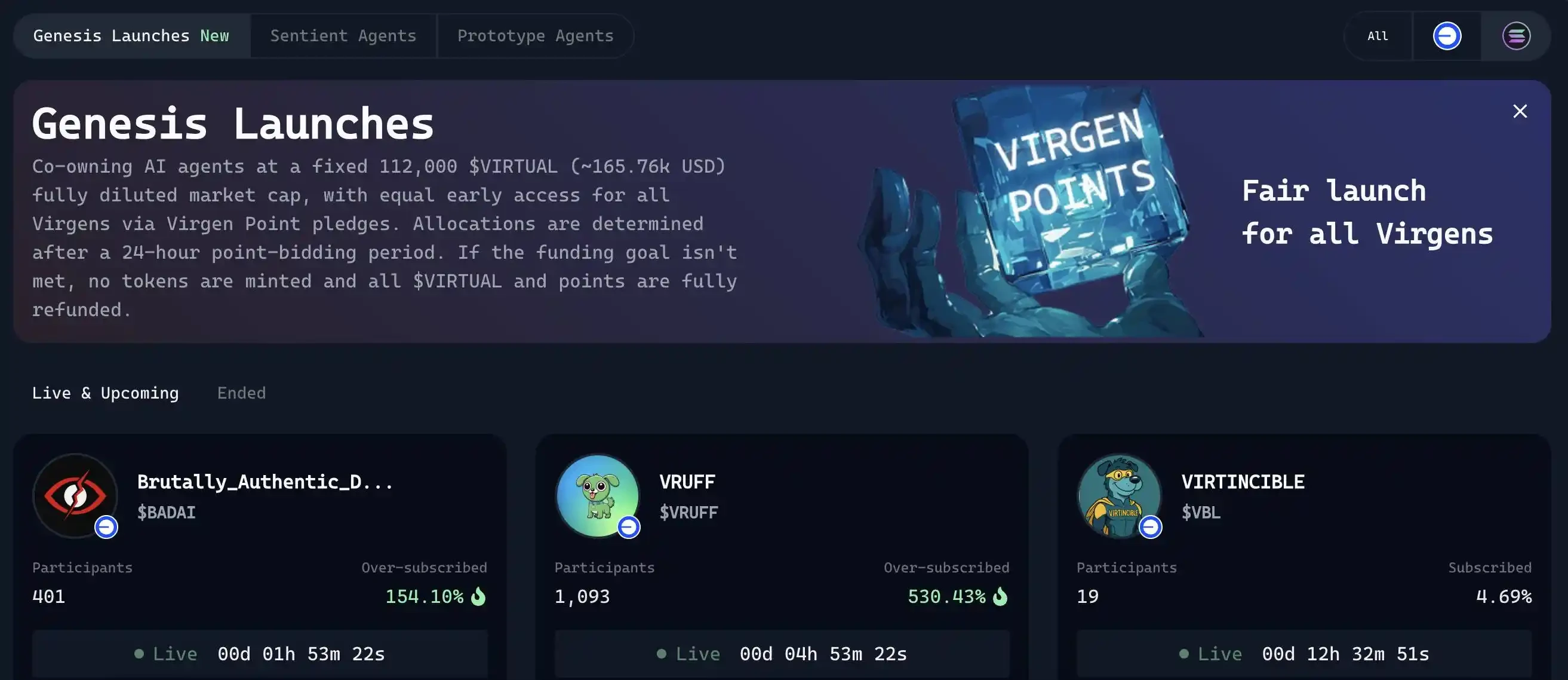 Genesis Launchsは、BaseとSolanaのVirtuals Protocolに基づいて最近立ち上げられたローンチプラットフォームであり、コミュニティユーザーに新しいAIエージェントプロジェクトのインキュベーションへの公正な早期参加を提供し、ボットやスナイパーが低価格で資金を調達するのを防ぎ、参加者の資金の安全性を保護することを主な目標としています。 各新しいプロジェクトは、112,000$VIRTUAL(約120,000ドル)の固定希薄化市場価値で始まり、ユーザーはVirginポイントを賭けて参加し、各ラウンドで24時間のオークション期間があり、ポイントが多ければ多いほど分配金が高くなります。 現在、ユーザーがポイントを獲得するには、主に3つの方法があります:SentientトークンとPrototype Agentトークンに投資してTrenchorポイントを獲得する方法、$VIRTUALトークンを保有することで獲得する方法、$VADERトークンをステーキングして未使用のポイントは30日後に失効します。