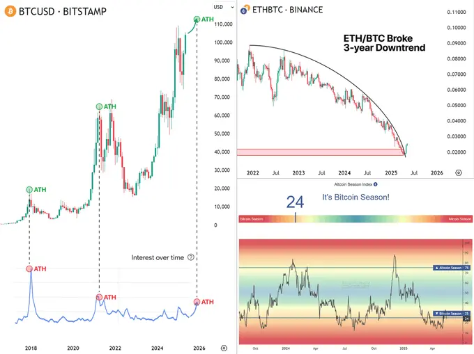 ペクトラのアップグレードをきっかけに、イーサリアムは急騰し、ETH/BTCの3年間の下落傾向を打破しました。 疑う人は皆、信者になります。 ビットコインの優位性は、2024年11月以来、3日間で最も急激な下落を経験したばかりです。 アルトコイン市場のセンチメントは氷点下まで落ち込み、このわずかな上昇の後でも、小売業の参加者は史上最低の水準にとどまりました。 私の意見では、ペクトラのアップグレードはゲームチェンジャーです。 このソリューションは、イーサリアム主導の模倣ブームに対する最大の障害である、ユーザーインターフェースとユーザーエクスペリエンスレイヤーも解決します。