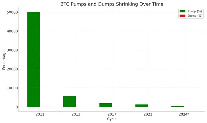 ビットコインの急騰幅(パーセンテージで)は小さくなり、急落も同様です。時価総額が拡大すると、その価格変動は次第にそうなります。毎年、ビットコインが投機的資産ではなく、価値の保存資産としての傾向がますます明らかになっています。