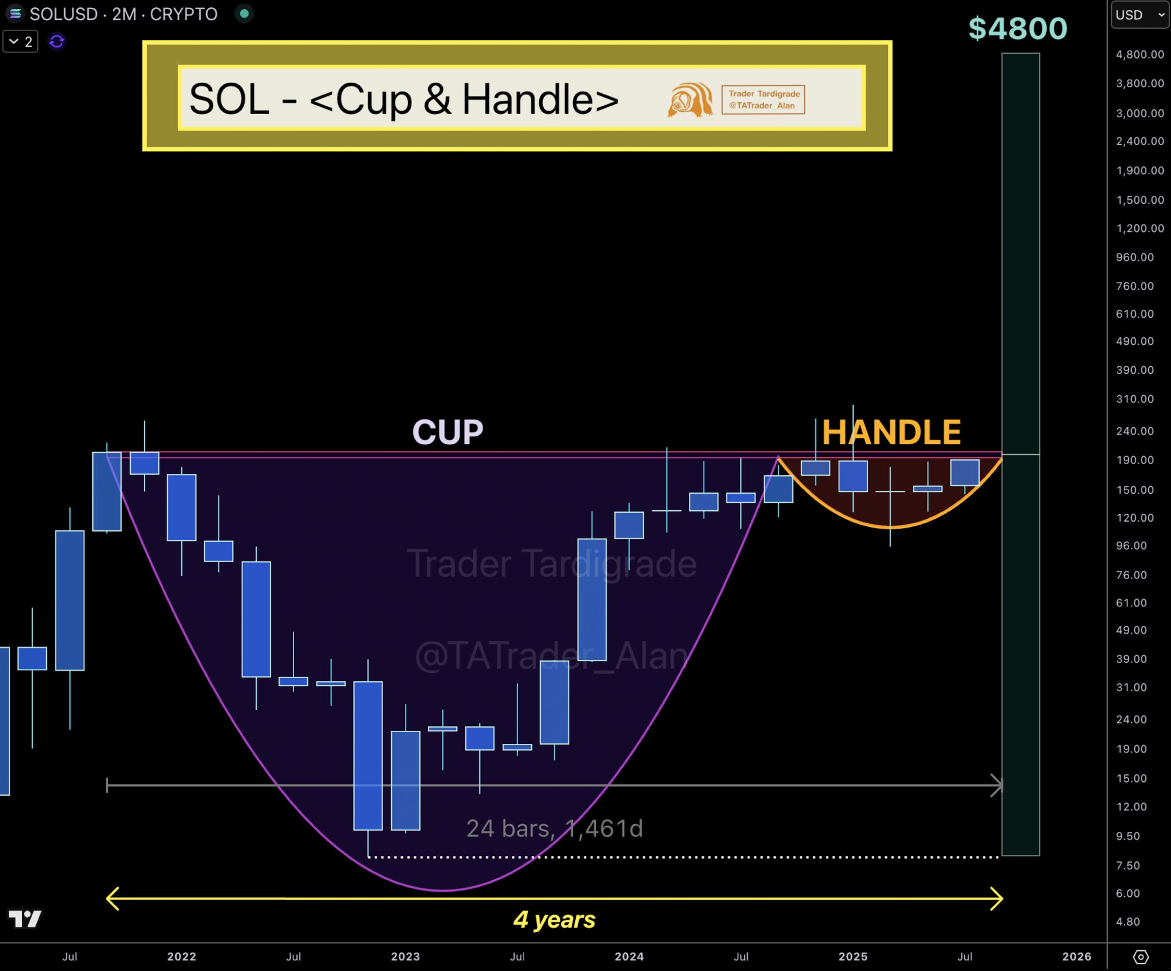 暗号分析者のTrader Tartigradeは、2021年に遡る大きなカップハンドルパターンを発見し、今週、アルトコインが200ドルの水準に再び戻るにあたり、突破は「差し迫っている」と述べました。