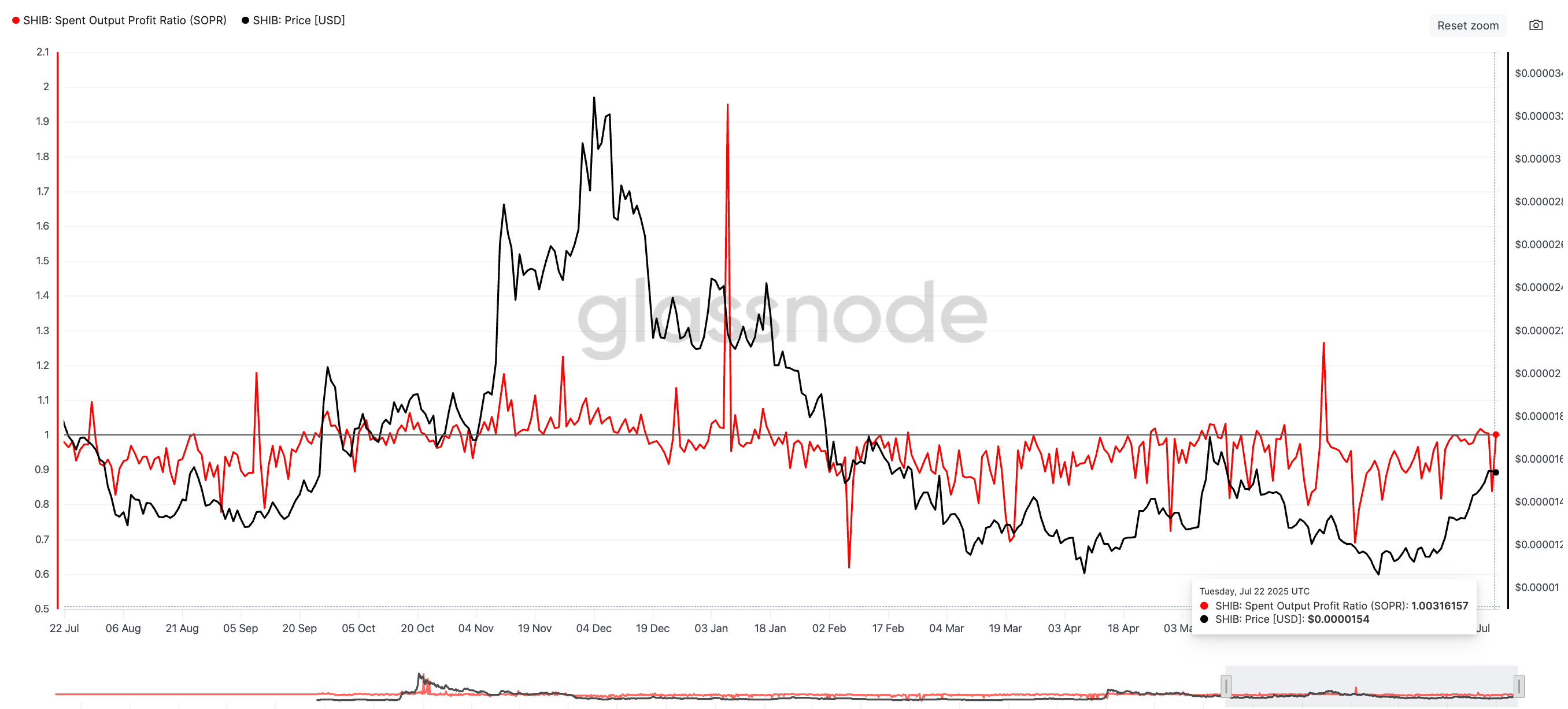 数週間そのラインを下回った後、現在その値は約1.0です。4月30日、価格が0.00001327ドルに近づいたとき、SOPRは約0.72まで下落しました。その後、価格は約28%上昇し、0.00001700ドル前後に達しましたが、SOPRは1.0に戻りました。