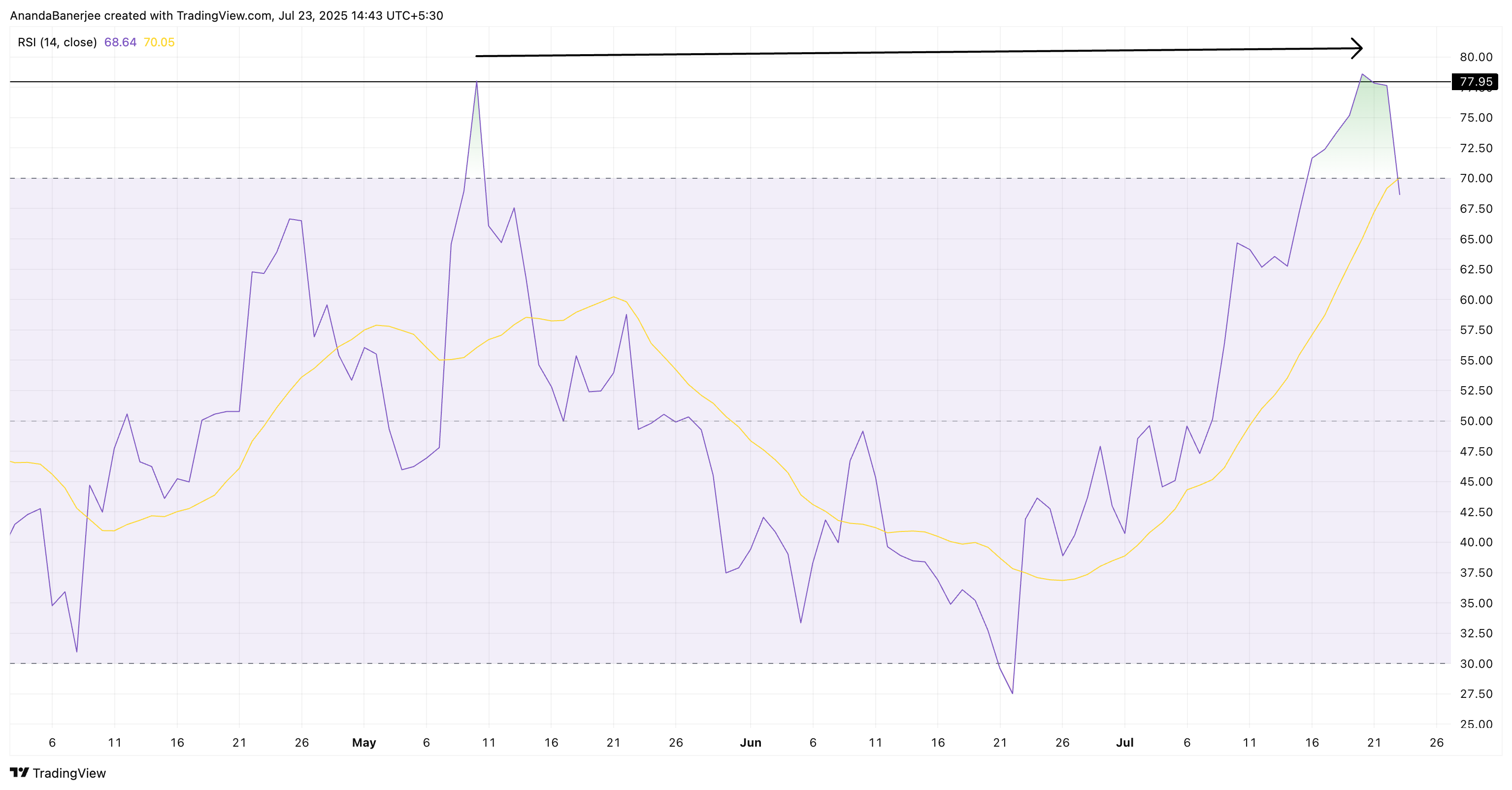 これは、価格がまだブレイクしていないにもかかわらず、買い手の力が強まっていることを意味します。もしRSIが引き続き上昇し、価格もそれに伴って上昇すれば、ブレイクの可能性が高まります。もしRSIが下落し、価格が停滞している場合、トレンドは一時停止する可能性があります。