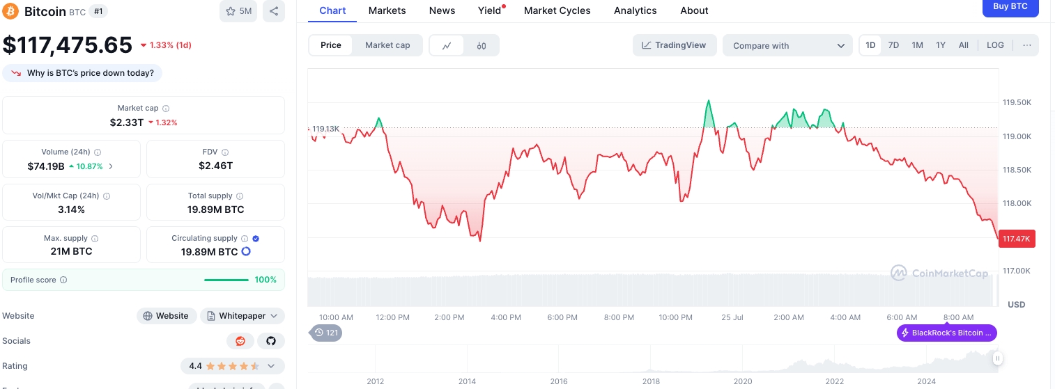 今(25)日アジア早朝、ビットコインは約117,470ドルで報告され、1日の下落幅は1.33%です。